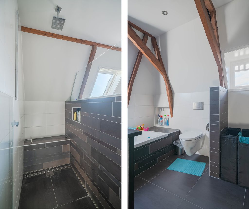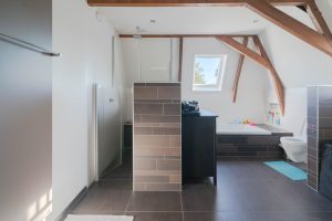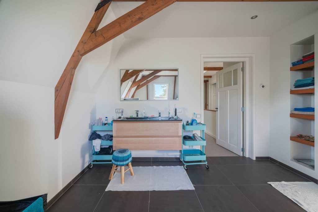 De ruime badkamer op de verdieping van circa 16m2 heeft een royale inloopdouche, bad, toilet en een dubbele wastafel, de vloer is voorzien van vloerverwarming. De woning verkeert in zijn geheel in uitstekende staat en is volledig gemoderniseerd.