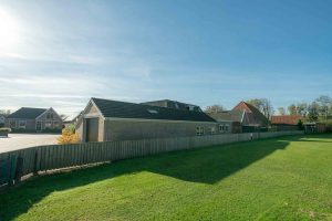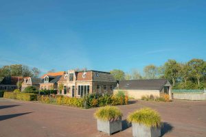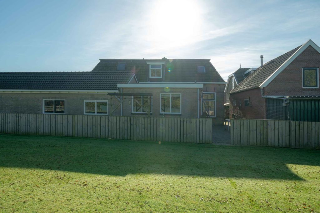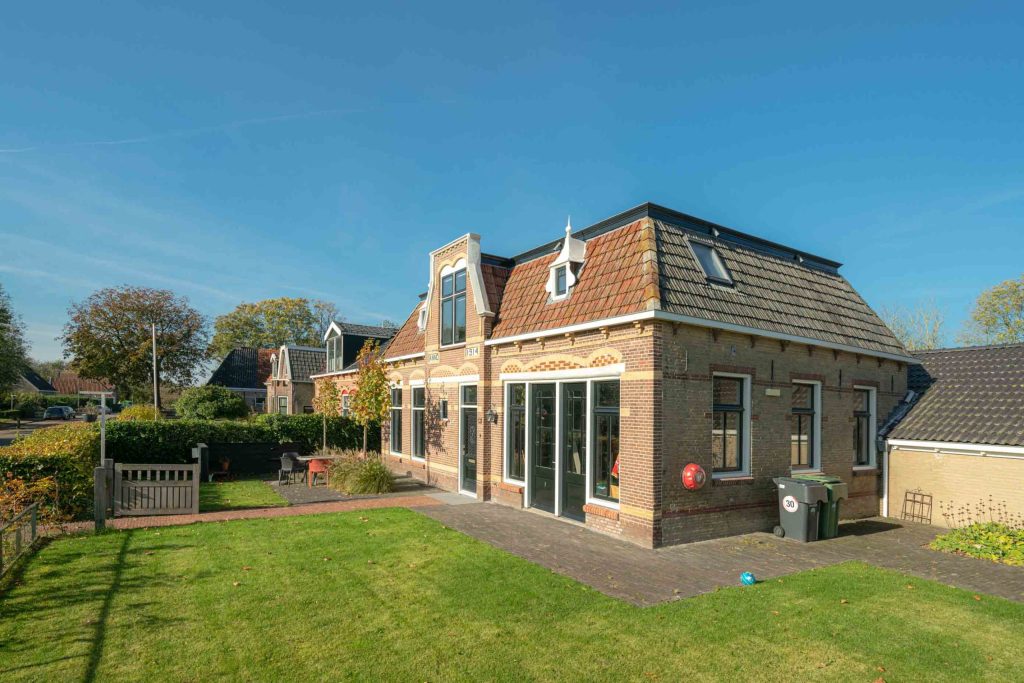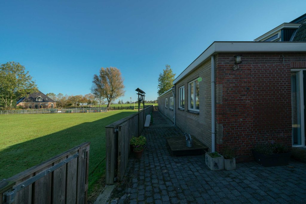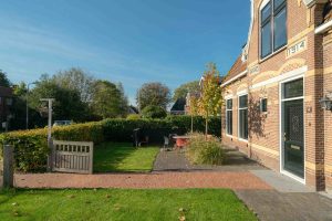 De entree naar de woning heeft een mooi klinkerpad met aan weerszijden gras. De lindebomen geven de tuin een mooi traditioneel karakter. De voortuin van de woning is gelegen op het zuidwesten, een gunstige ligging met veel lichtinval. Daardoor is hier een mooie zitplek gecreëerd. Achter de woning is een betegelde tuin welke grenst aan het plaatselijk kaatsveld.
