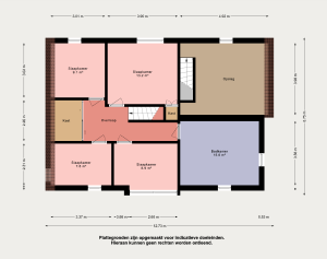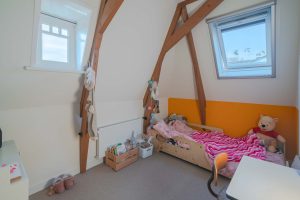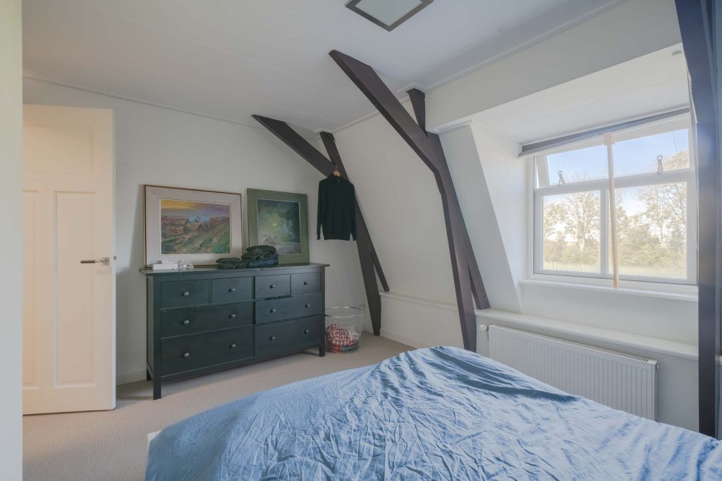 Op de verdieping is op de overloop een kastruimte gecreëerd. Er bevinden zich vier ruime slaapkamers van 13m2, 9m2, 9m2 en 8m2. Allen hebben vloerbedekking en worden verwarmd middels radiatoren.