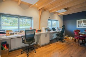 De aansluitende loods is gedeeltelijk bij de woning getrokken. Hier is een kantoor gerealiseerd met vaste kastruimte. Verder dient de loods voor opslag en als garage.