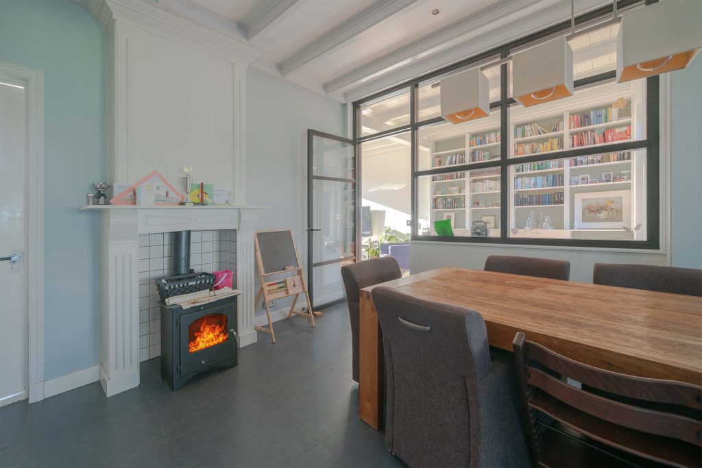 De uitstraling van deze woning is meteen indrukwekkend en vol karakter. Talrijke authentieke details vallen direct op, zoals de sierlijke dakkapellen, hoge ramen, zorgvuldig gemetselde gevels en een charmante voordeur. Binnen is er een ruime doorlopende leefruimte tussen de woonkamer en woonkeuken, die indien gewenst, afgesloten kan worden. Het prachtige balkenplafond is in het zicht gebleven en draagt bij aan de warme sfeer, terwijl de vloerverwarming op de begane grond zorgt voor aangename warmte. In de eetkamer zorgt een houtkachel voor extra gezelligheid. De woning is volledig geïsoleerd, waardoor het binnen altijd comfortabel is.
