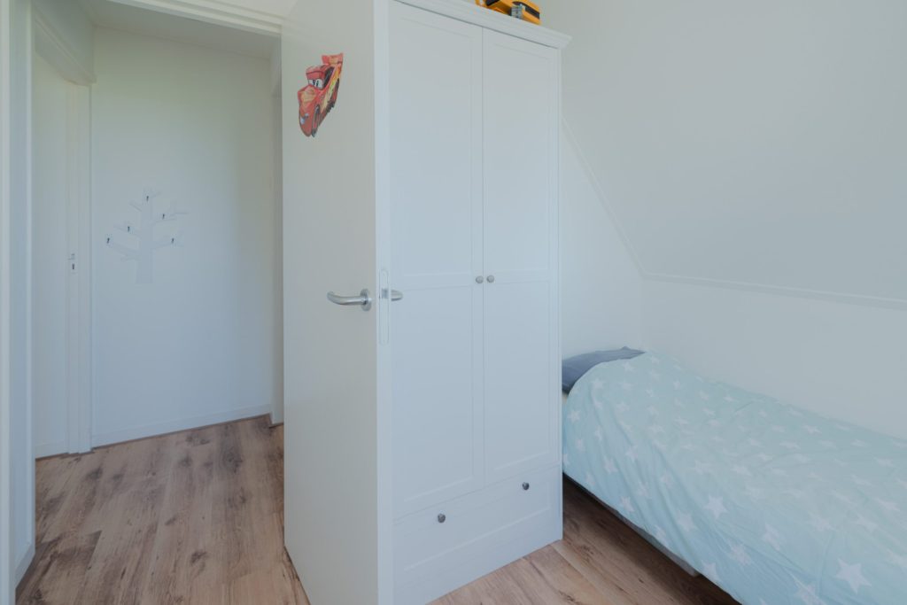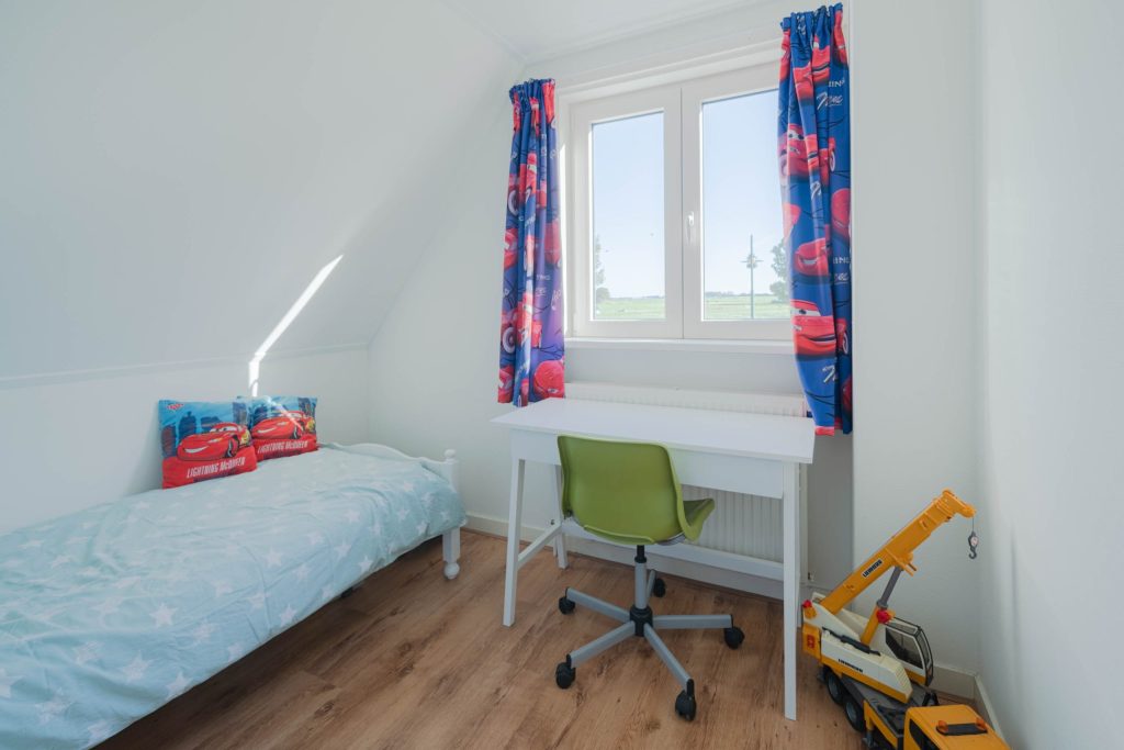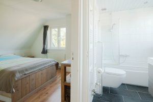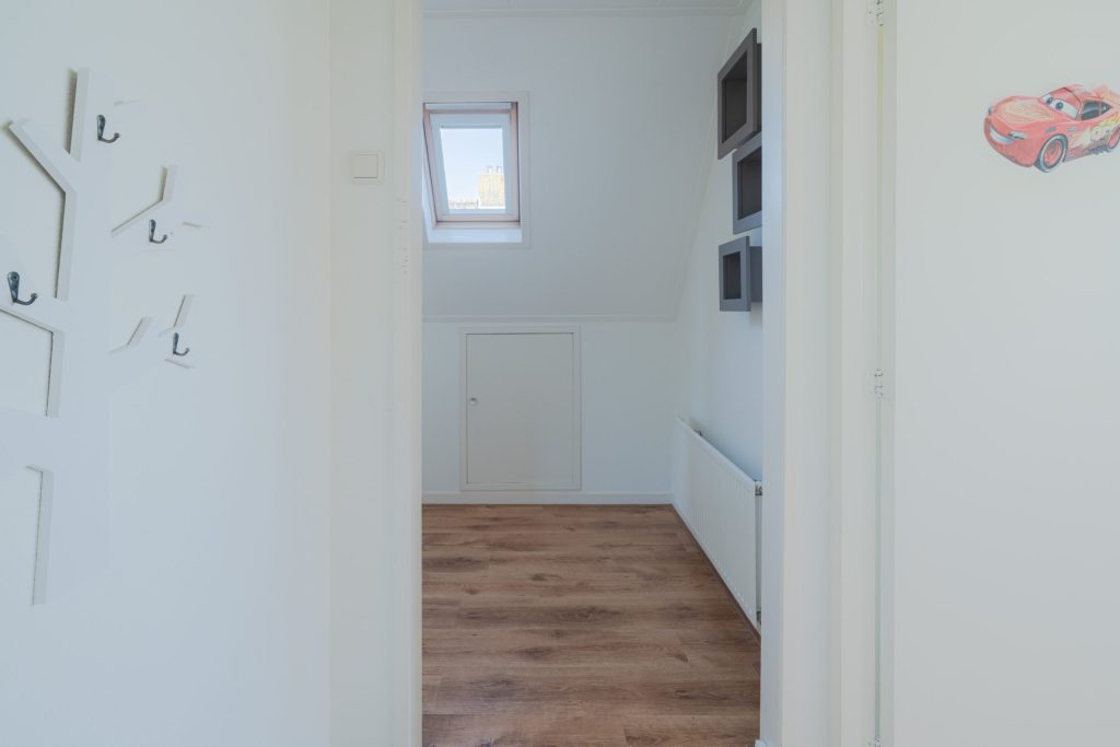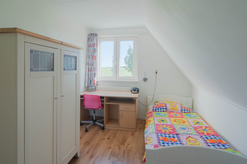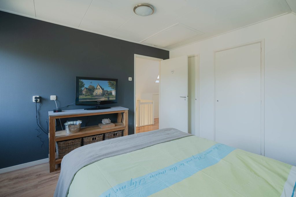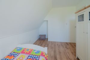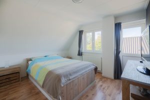 De woning heeft op de verdieping een overloop met een knieshot ruimte. Er zijn drie slaapkamers van circa 13m², 10m² en 7m² en een badkamer aanwezig. De grootste slaapkamer van circa 13m² heeft twee inbouwkasten in de kamer en een deur om het platdak te bereiken. De overige twee slaapkamers bevinden zich aan de voorzijde van de woning en hebben uitzicht over de landerijen. De badkamer heeft een douche/bad, toilet en wasbak. Alle ruimtes zijn voorzien van radiatoren. De ondervloer van de verdieping is van hout en bedekt met laminaat. De badkamer is voorzien van een betonvloer met vloerverwarming, er is een douchebad, toilet en wasbak aanwezig. Een vlizotrap geeft toegang tot de opbergzolder.
