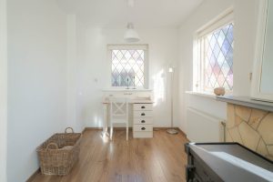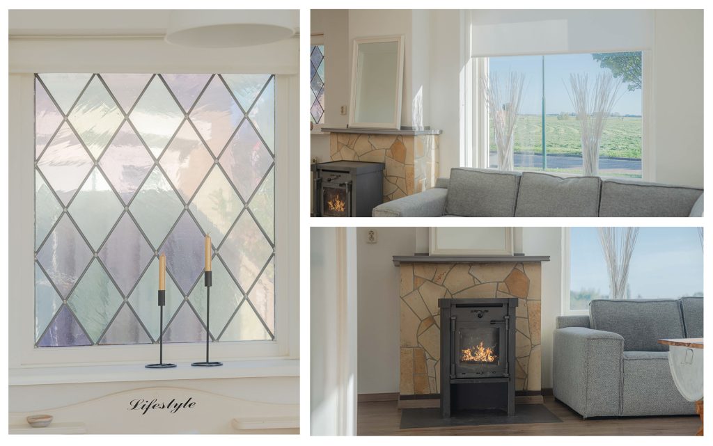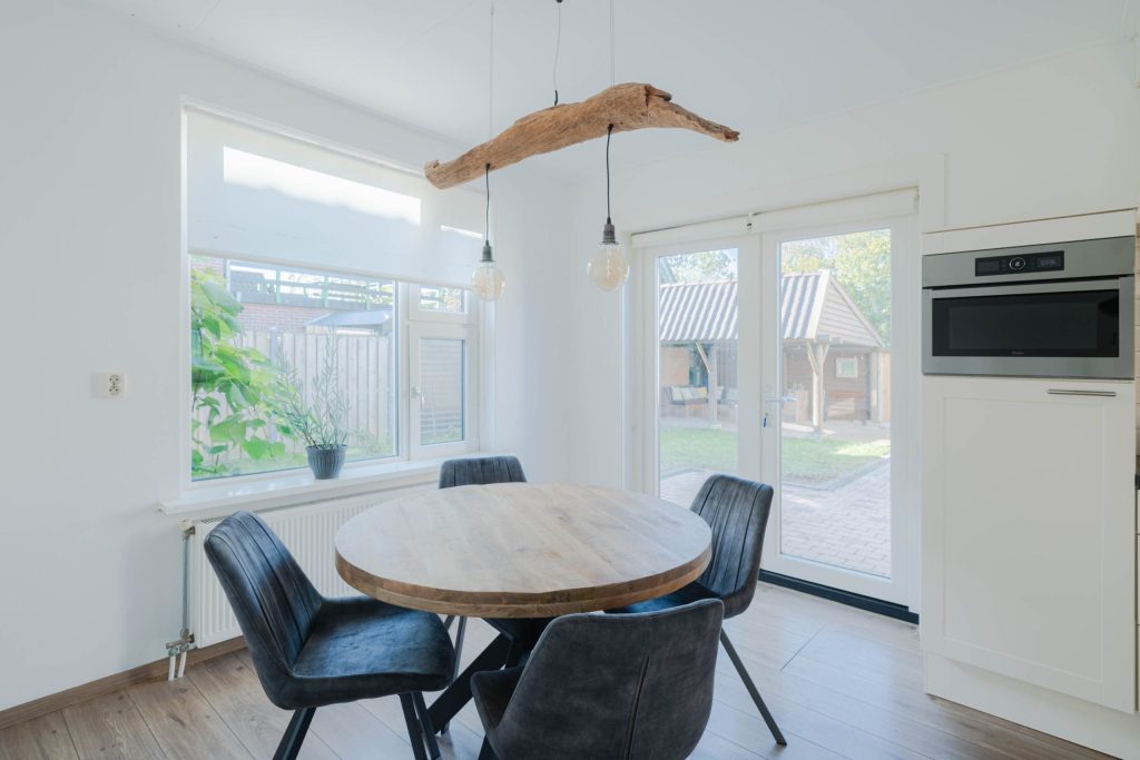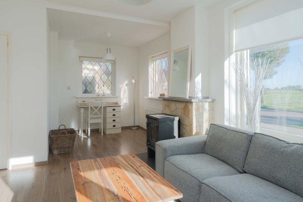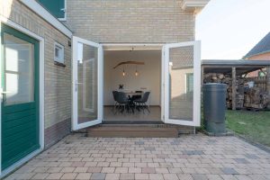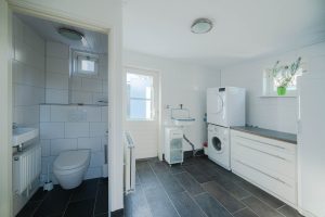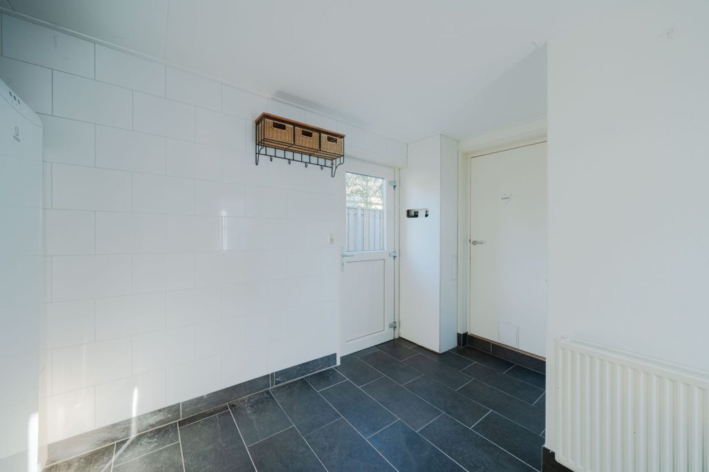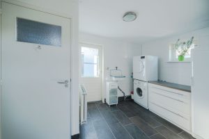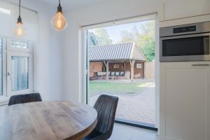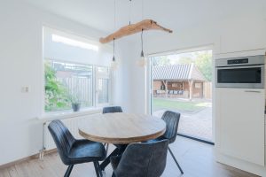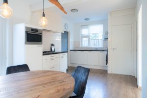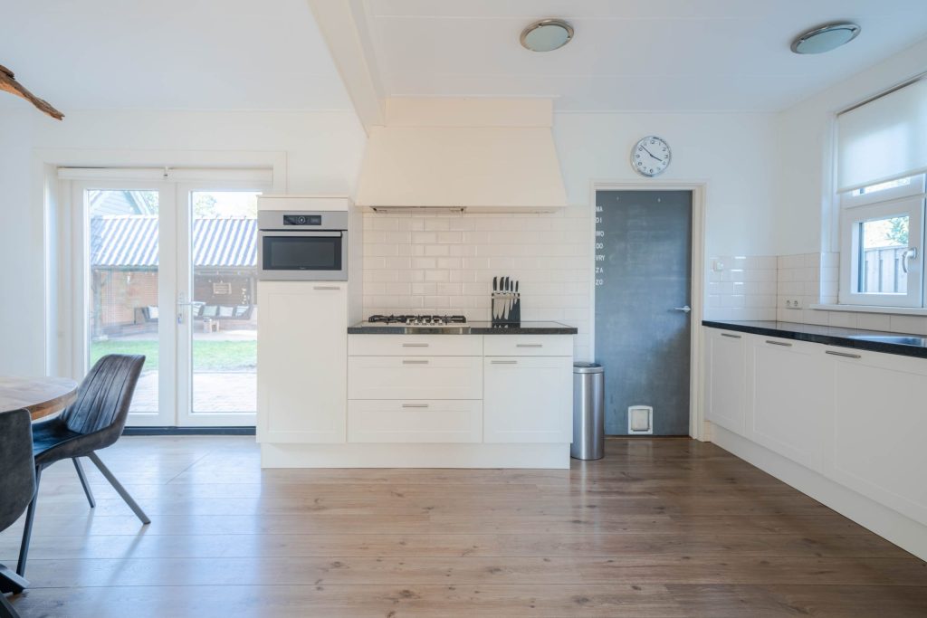 De woonkamer van circa 23m2 geeft uitzicht over de landerijen en heeft over de gehele dag zonlicht. Vanuit de woonkamer is de woonkeuken te bereiken, door de tussendeur kunnen de ruimtes van elkaar worden afgesloten. De woonkeuken van circa 20m2 is ruim opgezet en vanuit de eettafel is er door de openslaande deuren zicht op de tuin. De keuken zelf is van alle gemakken voorzien, inbouwkoelkast, -vaatwasser en -oven. 5 pits gaskookplaat en een stenen keukenblad. In de bijkeuken bevindt zich het toilet en witgoedaansluitingen. De vloer in de bijkeuken is van steen.