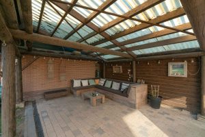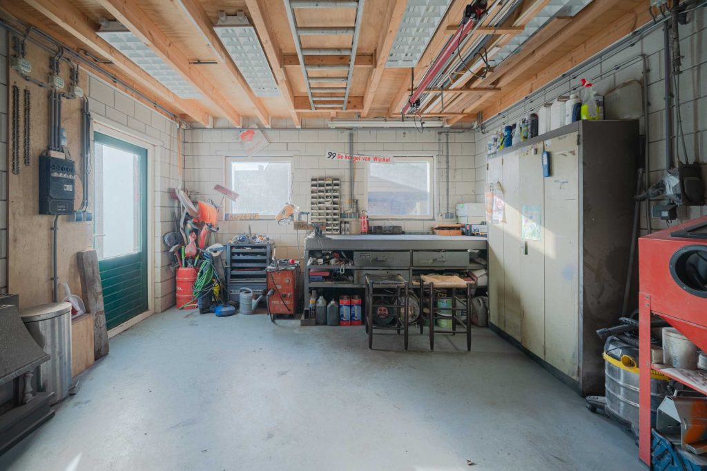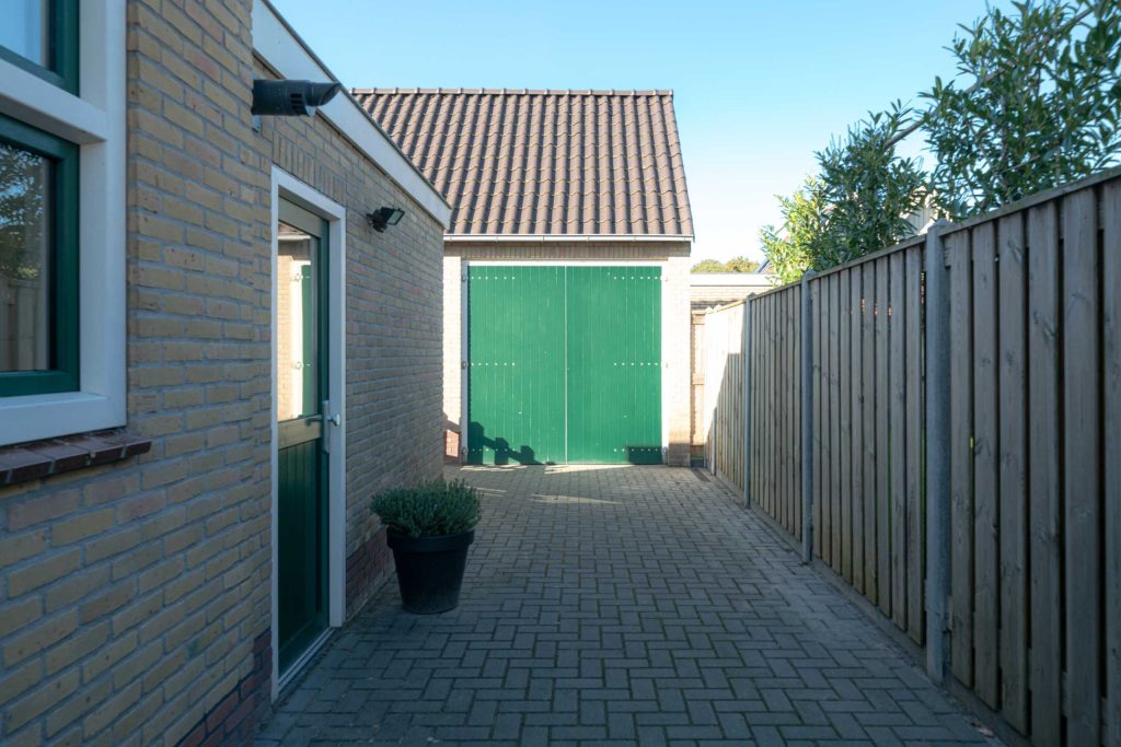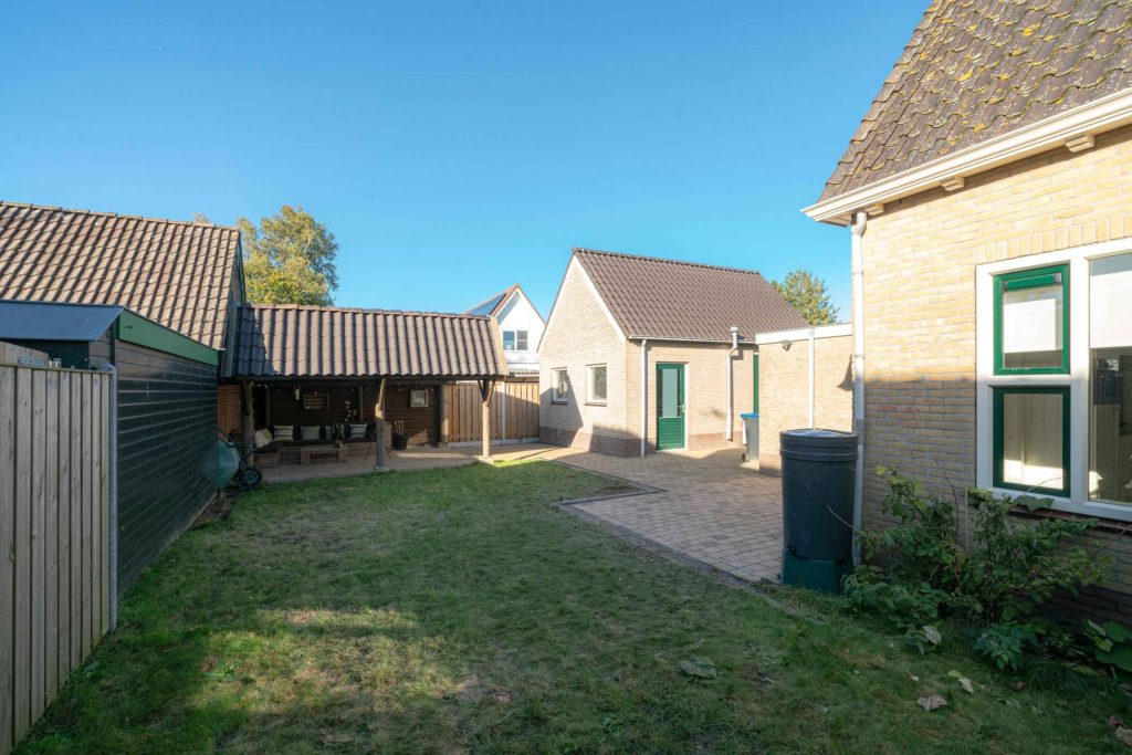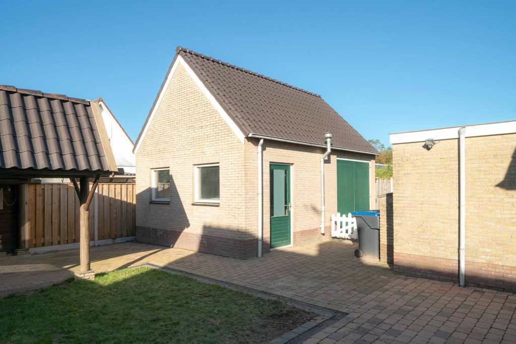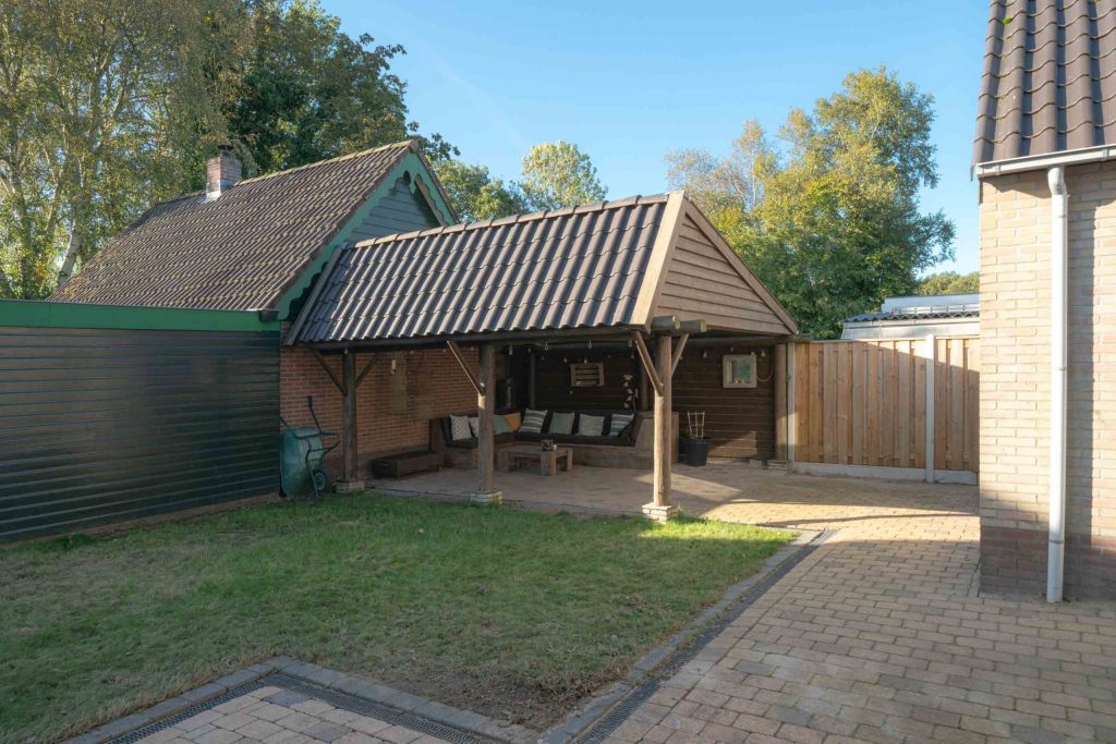 De achtertuin van de woning is gelegen op het Noordwesten en heeft een ruime overkapping zodat er langdurig in de tuin kan worden gezeten. Er is stroom aanwezig in de overkapping. De woning heeft een eigen oprit waarop meerdere voertuigen kunnen worden geparkeerd. De oprit loopt over de gehele lengte van het perceel en komt uit bij de garage waar nog een auto kan staan. De garage van circa 29m2 fungeert momenteel als klus hok. De vloer is van beton. Er is een gaskachel en krachtstroom aanwezig. Boven de garage is een vliering.