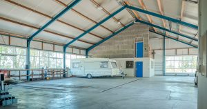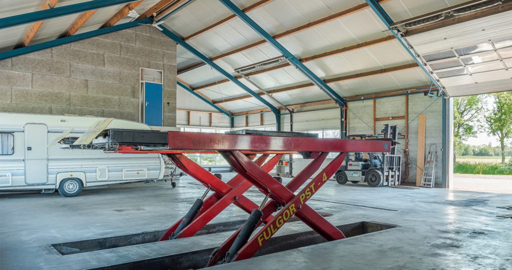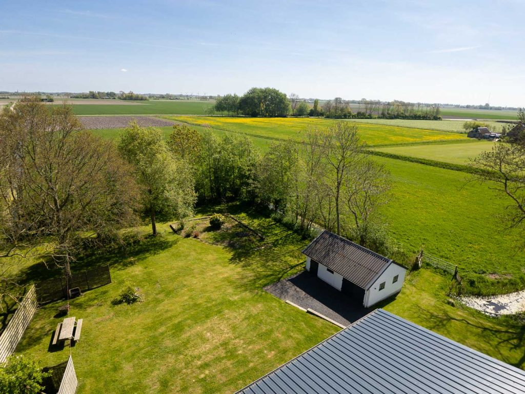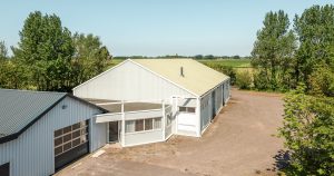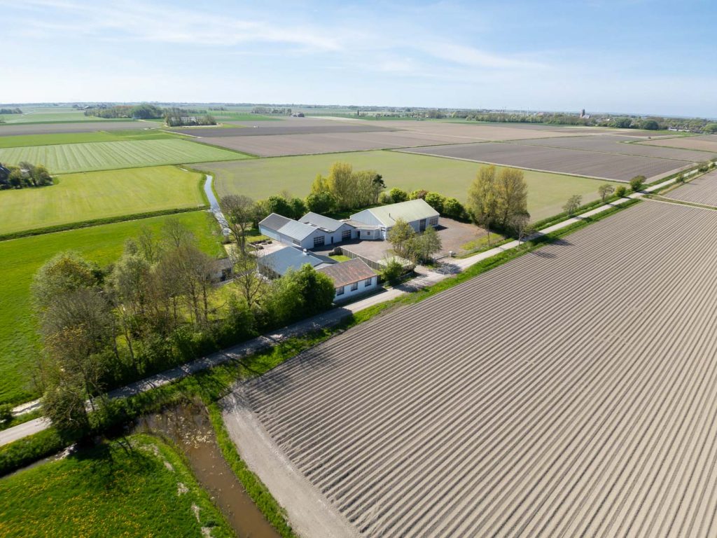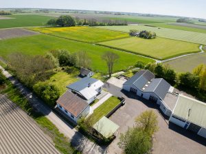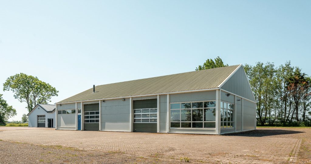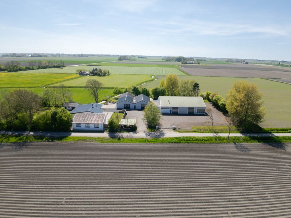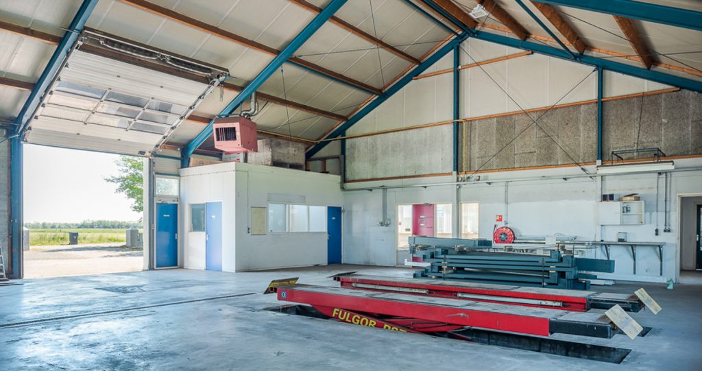 Verder op het erf ligt het bedrijfscomplex met diverse aaneengeschakelde loodsen, die momenteel in gebruik zijn als opslagruimte en stalling. De loods is grotendeels gemoderniseerd: asbest is verwijderd, er zijn nieuwe dakpanelen en een deels vernieuwd verlichtings- en camerasysteem geïnstalleerd. Er zijn vier overheaddeuren voor gemakkelijke toegang, een verzonken hefbrug van 4 ton in de grootste loods, en een kantoorruimte van circa 59m2 met pantry en toiletruimte – ideaal voor eigen gebruik of verhuur. Doordat de loodsen los van de woning staan is het privé gedeelte eenvoudig af te scheiden van het zakelijke deel.