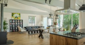 Leefgedeelte: Vanuit de hal komt u het royale leefgedeelte binnen van ruim 82m2 groot. Hierin gaan de woonkamer en de woonkeuken naadloos in elkaar over. Door de grote glazen schuifpui op zonnestand voelt het licht aan. Vanuit de ramen in deze kamer kijkt u uit over de tuin. De ruimte wordt verwarmd middels radiatoren of een houtkachel. De keuken is met een functioneel kookeiland voorzien van een stenen blad met gaskookplaat en spoelbak. De keuken is netjes en voorzien van inbouwapparatuur, enkel de koelkast is vrijstaand. Het eet- en woonkamergedeelte maken de ruimte compleet en een gezellig geheel.