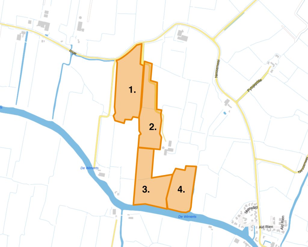 | Vorm, ligging, grootte ontsluiting | : | De percelen zijn te bereiken via een dam vanaf de Nessenwei te Oosthem. De percelen zijn onderling ook verbonden via een dam. De percelen zijn overwegend rechthoekig van vorm. De totale oppervlakte van de percelen is circa 16.38.95 Ha. |