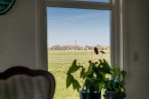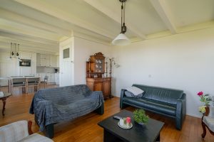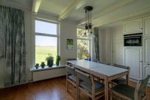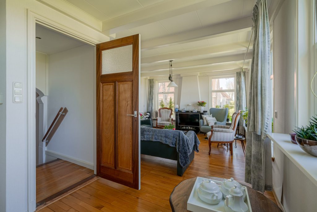 De woonkamer is via een korte trap vanuit de hal bereikbaar en heeft een oppervlakte van circa 23m2. Wat direct opvalt in de lichte ruimte is het uitzicht over de landerijen. De kozijnen zijn van hout (in 2017 nog geschilderd) en voorzien van dubbelglas. De vloer is van hout. Traditionele balkenplafond in het zicht. De ruimte wordt verwarmd met radiatoren.