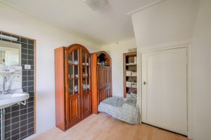 Naast de keuken bevindt zich een opslag- of slaapkamer van circa 7m2. De kamer is voorzien van laminaat en beschikt over een wasbak en inbouwkast. De ruimte is te gebruiken voor diverse doeleinden. Plafond is voorzien van zachtboard.