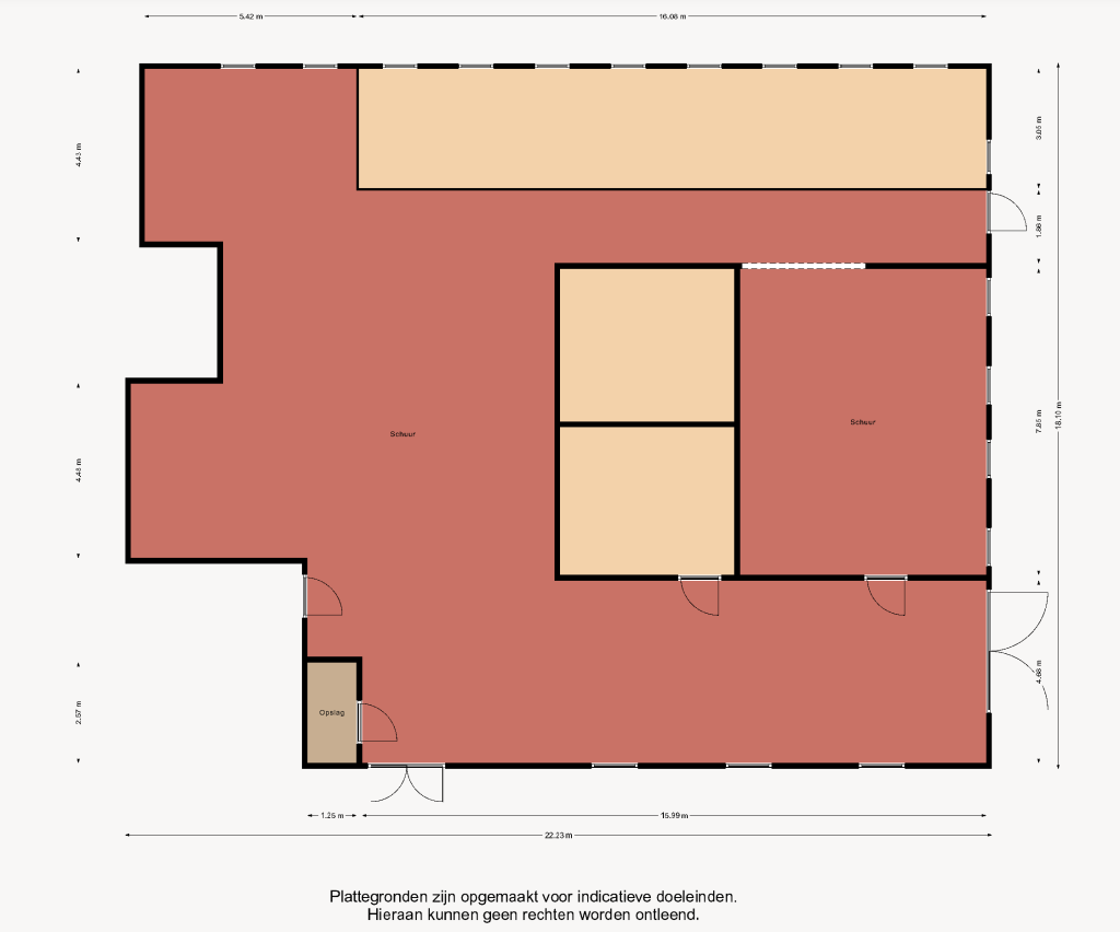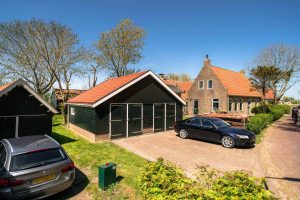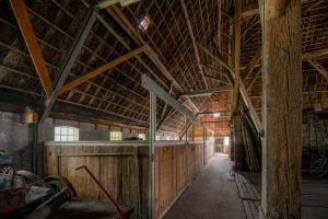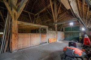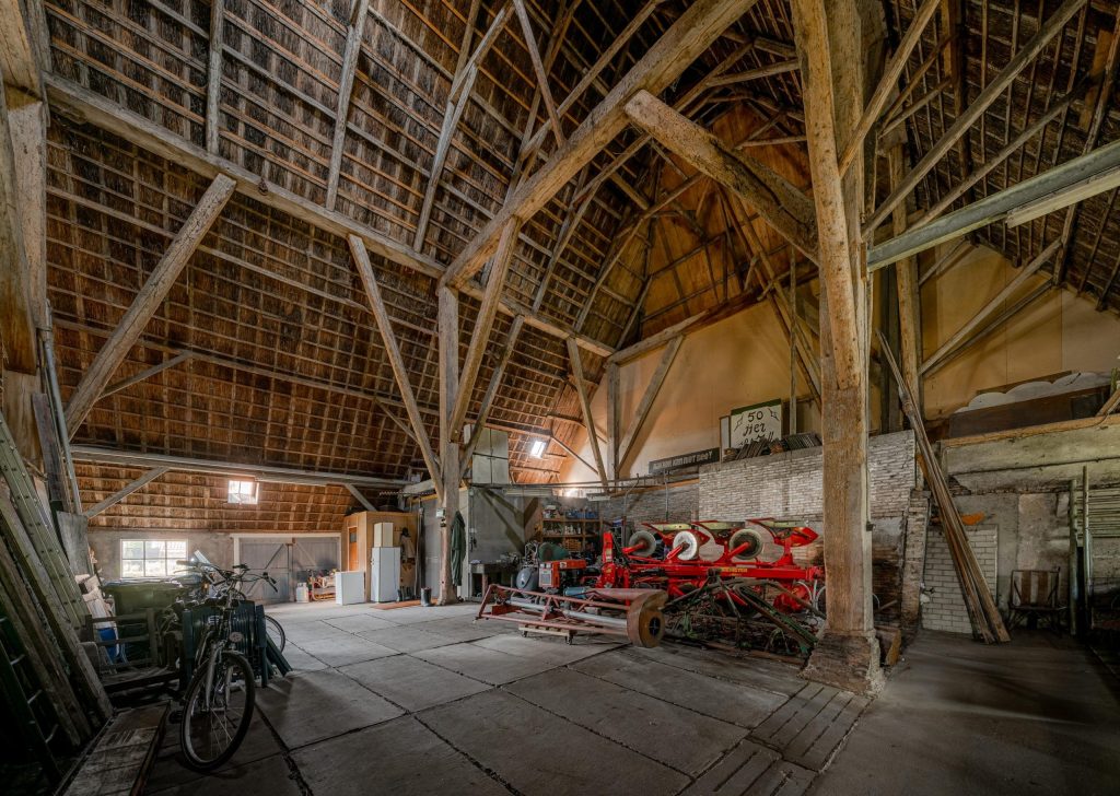 Verbonden aan de woning is de schuurruimte. Ook deze dateert uit 1815. De totale oppervlakte is circa 21,5 x 21,5 meter, totaal circa 462m2. De nokhoogte is circa 13,5 meter. Het geheel is traditioneel opgebouwd met houten gebinten. Enerzijds is het dak verstevigd met staal door het gedeeltelijk weghalen van de hooizolder. Het dak is met pannen gedekt en in de schuur met riet onderschoten. Status hiervan is goed. De hooizolder heeft een oppervlakte van circa 84m2. De schuur dient thans als ruimte voor diverse toepassingen waaronder: schuurruimte, garage, werkruimte en een vijftal ruime paardenboxen. Er is een gierkelder aanwezig van circa 100m3 voor het afvoerwater van de paarden. De schuur is voorzien van een betonvloer. Naast de authentieke hoge openslaande deuren (circa 3×3 meter) aan de achterzijde van de schuur bevinden zich ook nog een stel lage openslaande deuren en een normale deur (beiden circa 1,90 meter) welke toegang geven aan de schuur.