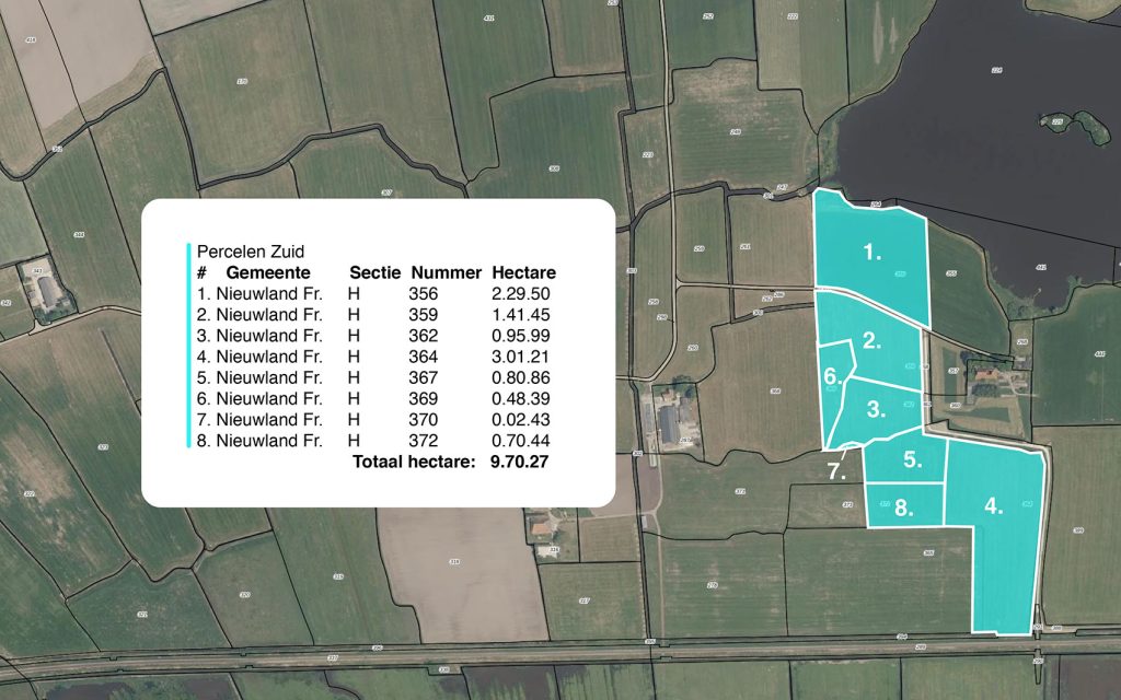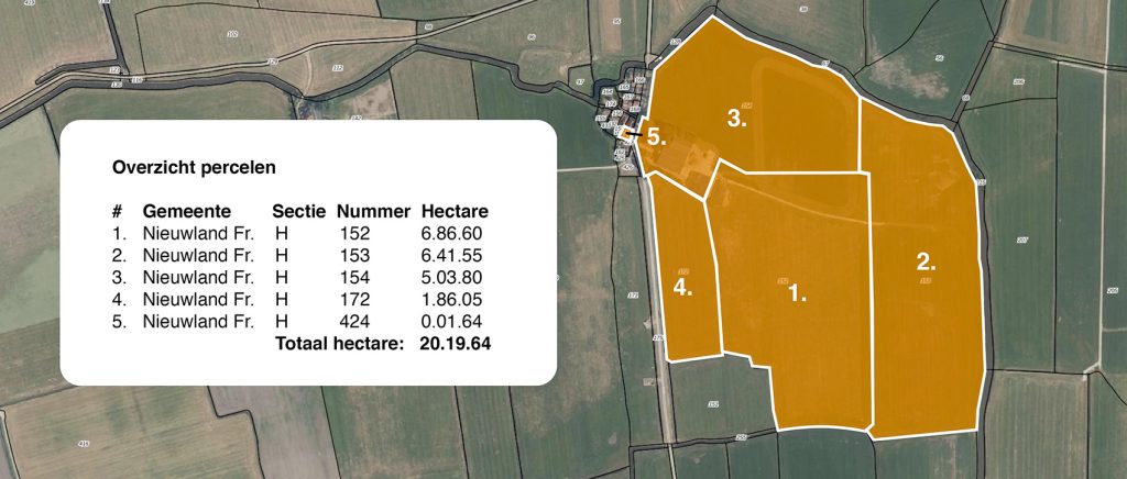 Inclusief ondergrond bedrijfsgebouwen en het woonperceel zijn de landerijen in eigendom circa 20.19.64 hectare. Al het land is verbonden aan de huiskavel.