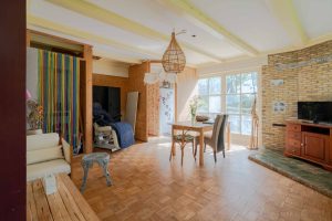 Na de woonkeuken komt u in de woonkamer. Een eveneens lichte ruimte door de vele ramen, het balkenplafond is nog in het zicht. De oude stenen van de voormalige schouw is aanwezig. De vloer is een mozaïekparket vloer in goede staat.