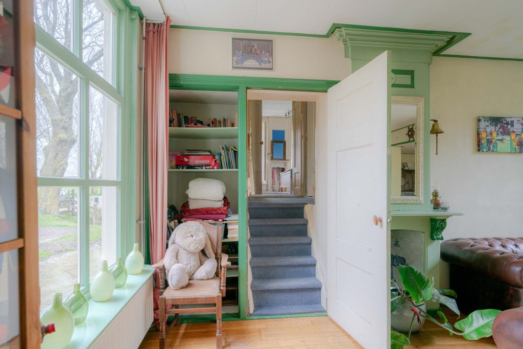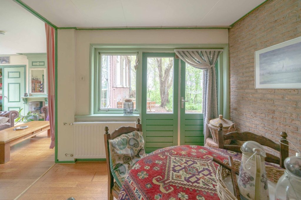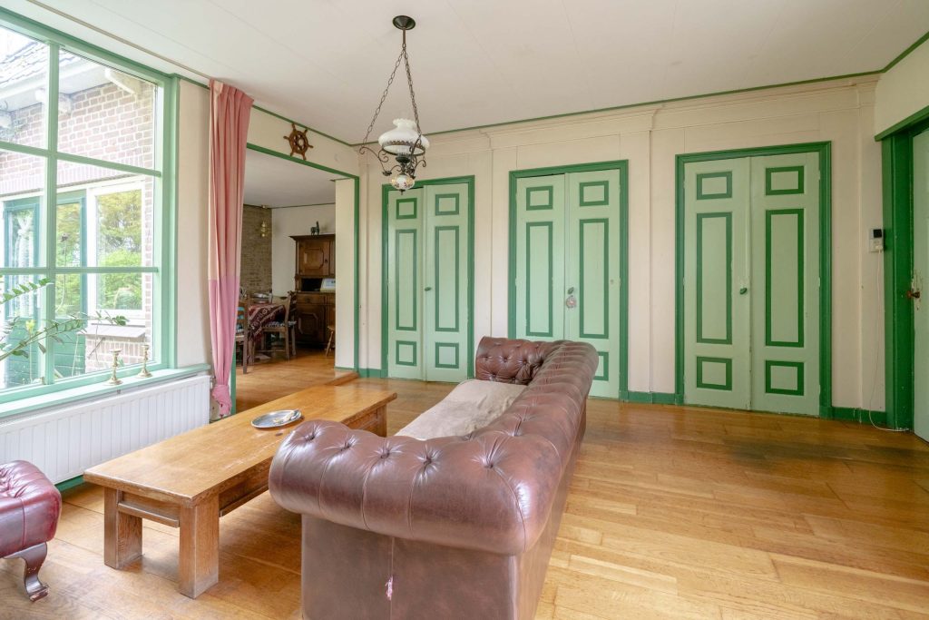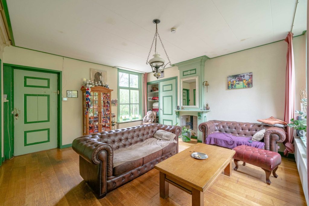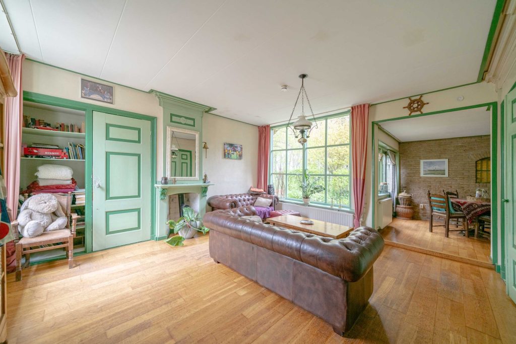 De royale woonkamer van circa 33m2 kent tal van traditionele elementen. Zo heeft de woonkamer hoge ramen, een sierlijke schouw in authentieke kleuren evenals de bedstee deuren welke nu fungeren als kastruimte. De ondervloer is van hout en belegd met een houten parketvloer. De ruimte wordt verwarmd middels radiatoren. Via een opstap is een verlengstuk van de woonkamer ter bereiken. Deze beschikt over een deur richting de voortuin.