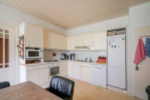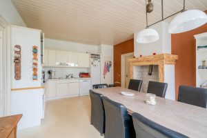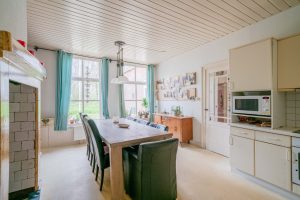 De woonkeuken van circa 24m² is een centrale ruimte van de boerderij. De ruimte voelt licht aan door de hoge ramen. De keuken is gedateerd en voorzien van een keramisch kookplaat, vaatwasser, koelkast, magnetron en oven. De ondervloer is van beton en heeft een zeil vloer.
