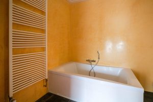 De badkamer bevindt zich op de begane grond en is te bereiken vanuit de hal. De badkamer is betegeld en gestuct. Er is een wasbak, inloopdouche en bad.