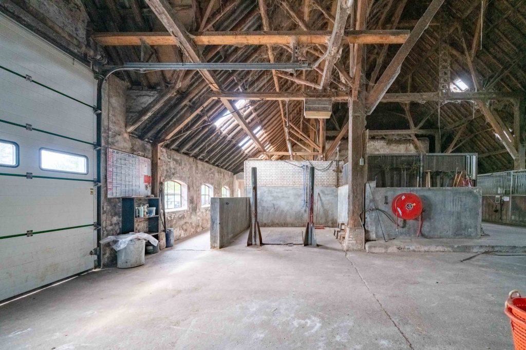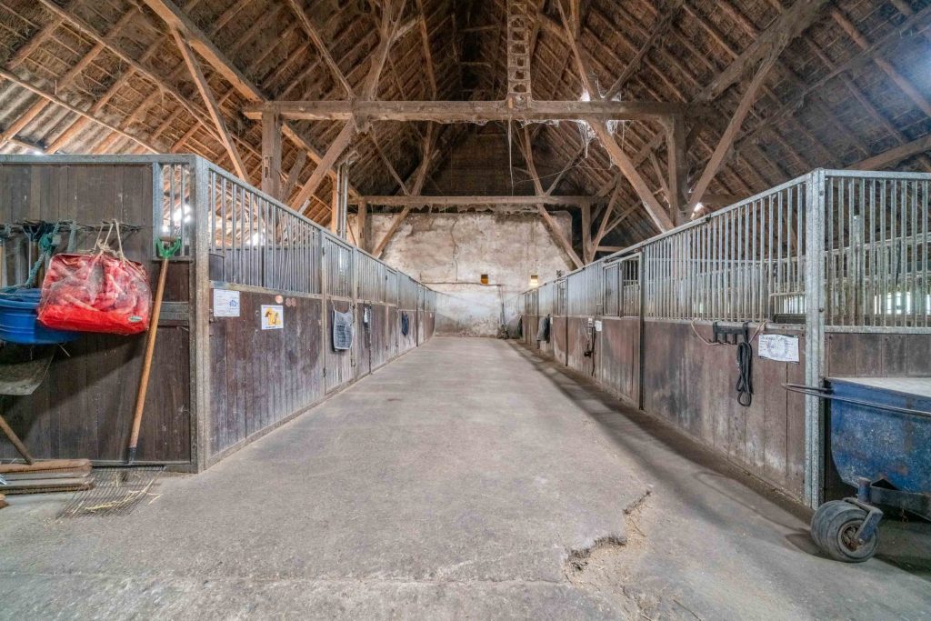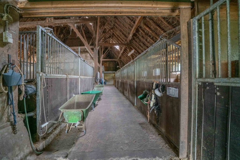 Achter het woongedeelte bevindt zich de schuur waar een 20-tal paardenboxen staan (circa 3m x 3m). De waterbakken in de paardenboxen zijn aangesloten. Er is een spoelplaats voor de paarden. In de schuur bevindt zich een kantoor ten behoeve van de manege. De totale oppervlakte van de schuur is circa 20 x 32 meter, totaal circa 591m². De nokhoogte is circa 18 meter. Het geheel is traditioneel opgebouwd met houten gebinten. Het dak van de schuur is enerzijds met riet en pannen gedekt. De andere zijde en achterkant is voorzien van golfplaten. Aan weerszijden van de nok is een uilenbord geplaatst. Er is krachtstroom aanwezig in de schuur. Er is een overheaddeur geplaatst van circa 3 meter breed en 3,5 meter hoog.