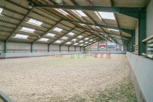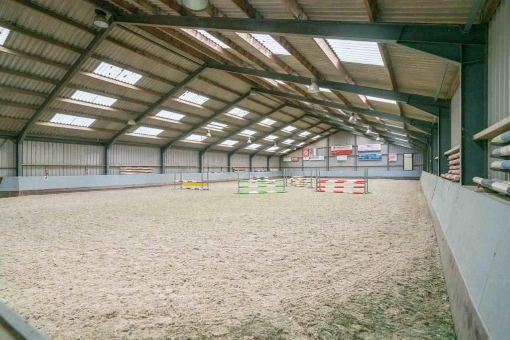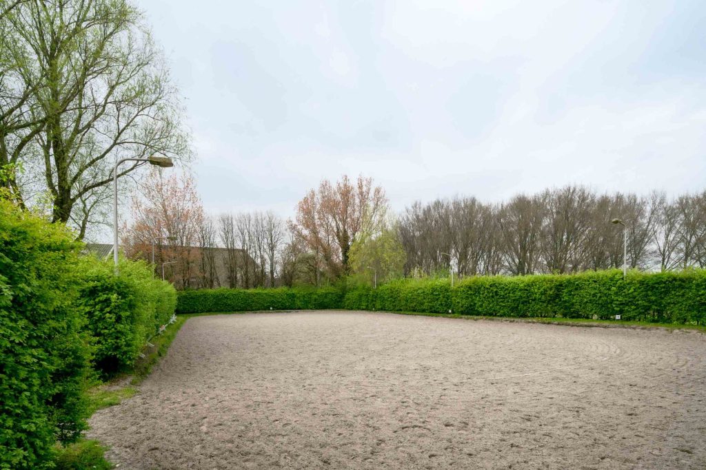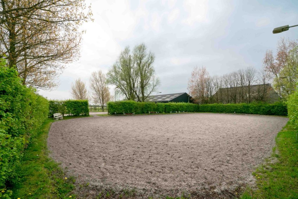Naast de schuur van de boerderij is een overdekte binnenbak gerealiseerd van 20m x 40m. De manege is opgebouwd met stalen H-balken. De muren van de manege zijn opgetrokken uit damwandprofiel, het dak is belegd met asbestvrije- en licht-doorlatende golfplaten. De nokhoogte van de manege is circa 8 meter. Vanuit een hoge toegangsdeur kunnen de paarden de manege betreden.