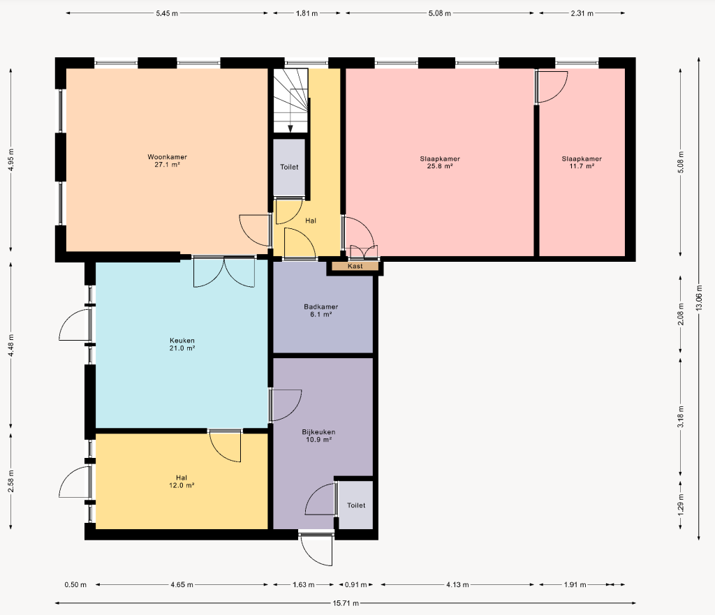 Naast de woonkamer is nog een gang. Hieraan zijn onder andere de toilet, badkamer, slaapkamer en trap naar de verdieping verbonden.