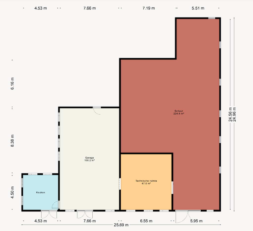 De schuur is toegankelijk middels een drietal staldeuren. De grootste staldeur is circa 3,5 meter hoog, voldoende om een camper of caravan binnen te stallen. De andere twee staldeuren zijn ruim 2 meter hoog. Het merendeel van de gruppe (mestgoot) is volgestort met beton. In de schuur is krachtstroom aanwezig.