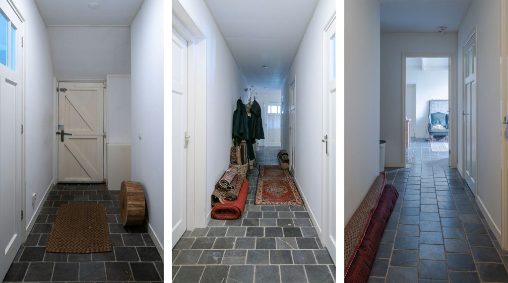 Bij het betreden van de boerderij komt u binnen via de centrale hal. Vanuit de hal zijn een groot gedeelte van de ruimtes te bereiken.