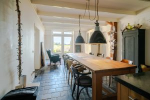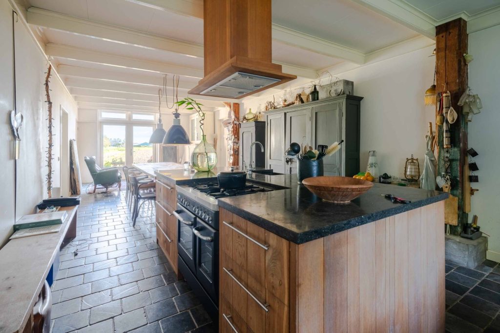 Vanuit de hal komt u binnen in de centraal gelegen woonkeuken. De ruimte is circa 46m² groot en is gelegen binnen het schuurgedeelte van de boerderij. De openslaande deuren geven zicht over de landerijen ten oosten van de boerderij. De ondervloer is van beton en heeft een stenen vloer met vloerverwarming. De keuken is voorzien van 5-pits kookplaat met dubbele oven. Vaatwasser en ingebouwde koelkast. Het keukenblad is van massief steen.