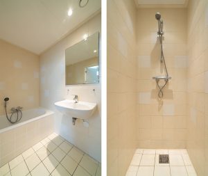 De badkamer bevindt zich op de begane grond en is te bereiken vanuit de centrale hal. De badkamer is betegeld en heeft een dubbele wasbak, designradiator en inloopdouche.