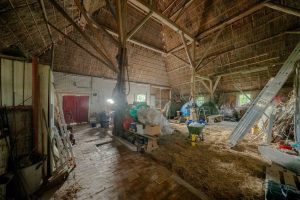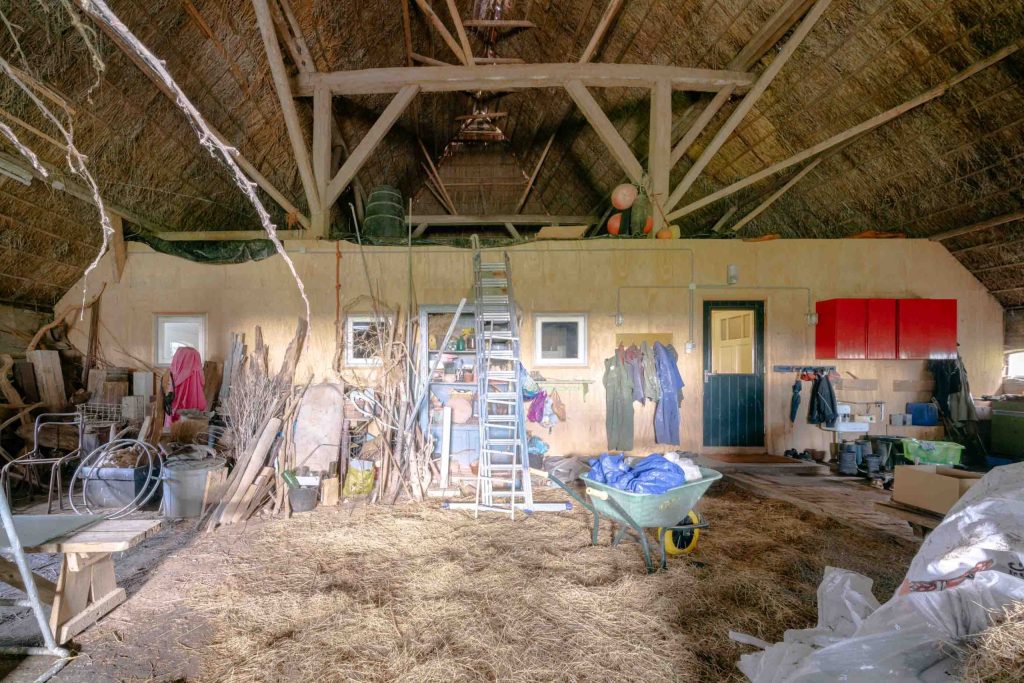 Achter het woongedeelte bevindt zich de schuur, deze is ingericht voor opslag en werkplaats. De totale oppervlakte van de schuur is circa 9,60 x 14 meter, totaal circa 134m². De nokhoogte is circa 9,5 meter. Het geheel is traditioneel opgebouwd met houten gebinten. Het dak van de schuur is bedekt met dakpannen en zijn met riet onderschoten. Aan weerszijden van de nok is een uilenbord geplaatst. Achter de schuur zijn de authentieke openslaande staldeuren aanwezig met een hoogte en breedte van circa 3 x 3 meter.