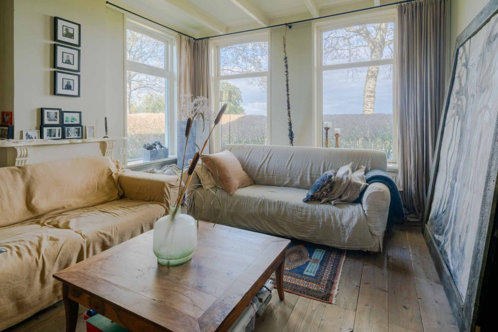De woonkamer van circa 22m2 bevindt zich in het voorhuis van de boerderij. Er zijn een drietal hoge ramen waardoor de ruimte licht aanvoelt. De oude schouw is nog in aanwezig, het rookkanaal niet meer in gebruik. De ondervloer is van hout en bedekt met een houten parketvloer. De ruimte kan worden verwarmd middels radiatoren.