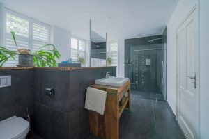 Badkamer: De badkamer zit op de begaande grond en is volledig verbouwd in 2012. Er is een ruime inloopdouche met regendouche, ruim ligbad, wc en wastafel.